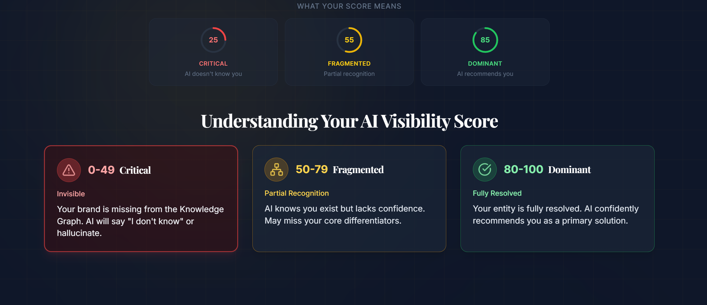 - A classification into one of three visibility tiers: Critical (0-49), Fragmented (50-79), or Dominant (80-100)